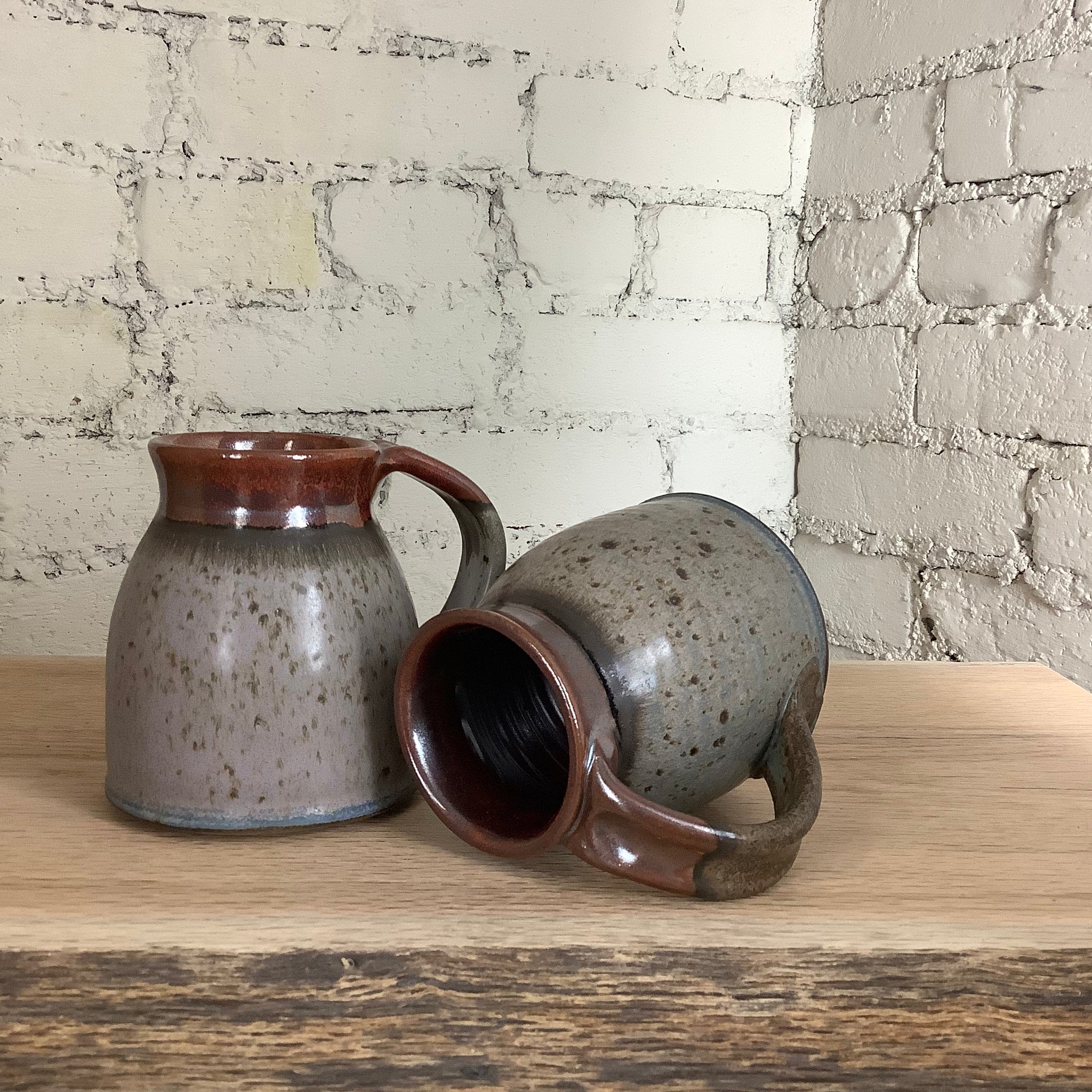 These mugs were fired onsite in our gas kiln at Goshen’s historic Old Bag Factory. We begin the firing in the evening and leave it to warm up overnight. In the morning, we raise the temperature to 2100 F, then perform a series of intentional temperature holds and decreases throughout the day to affect the color quality of the pieces within.