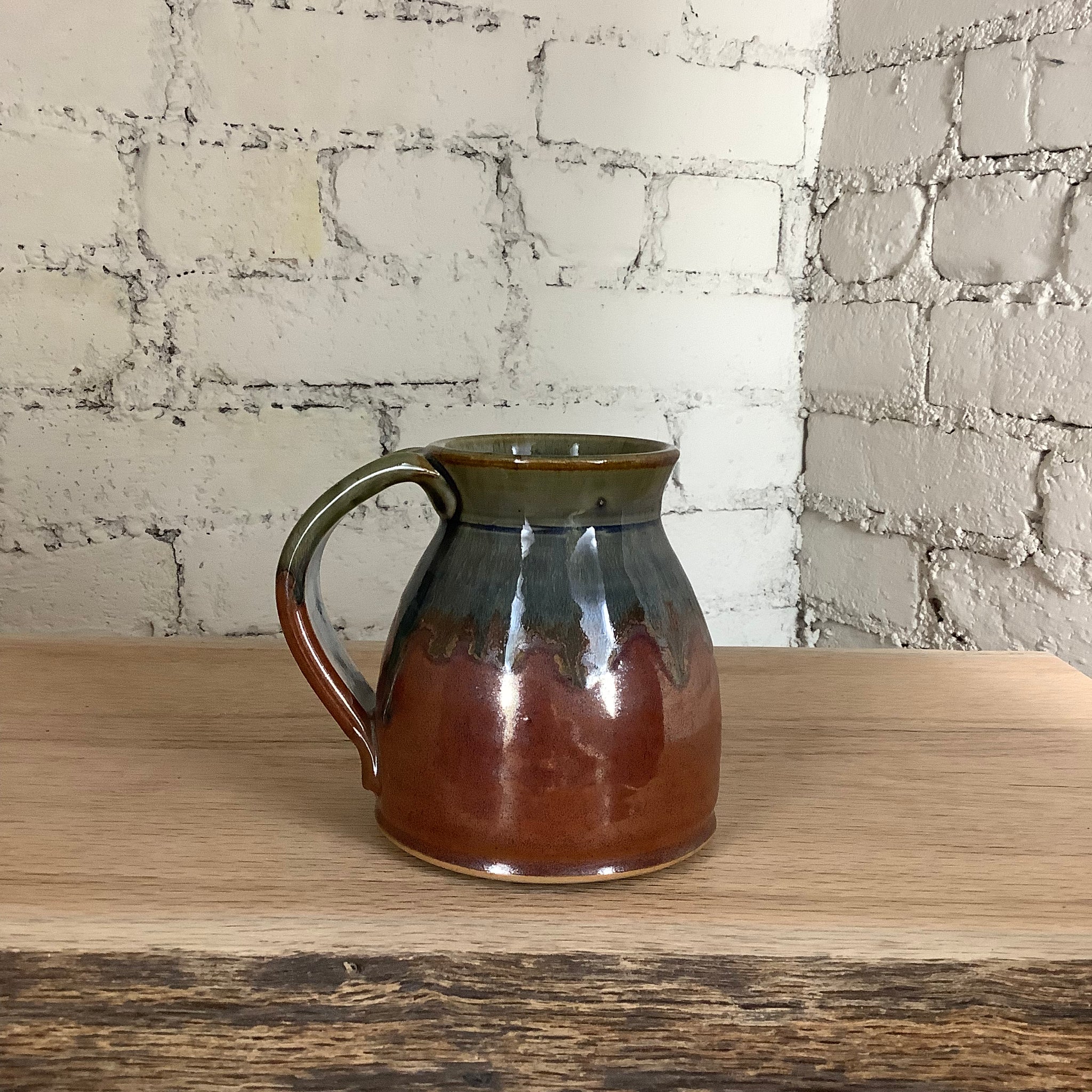 This mug was fired onsite in our gas kiln at Goshen’s historic Old Bag Factory. We begin the firing in the evening and leave it to warm up overnight. In the morning, we raise the temperature to 2100 F, then perform a series of intentional temperature holds and decreases throughout the day to affect the color quality of the pieces within.