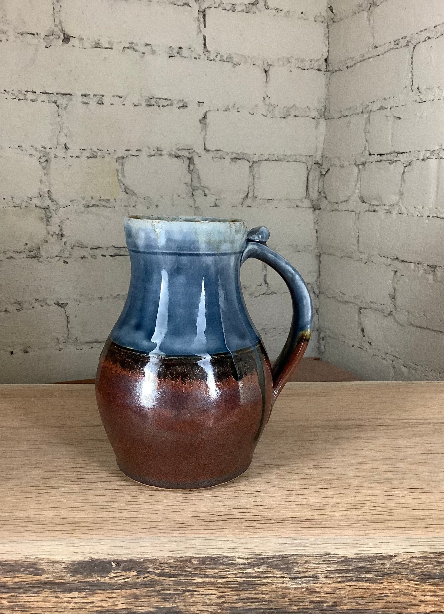 This piece was thrown on the potter's wheel, glazed by hand, and fired onsite in our gas kiln at Goshen’s historic Old Bag Factory. It stands 6.5” tall and 3” wide across the rim, with a 3.5" base. It holds about 26 ounces.