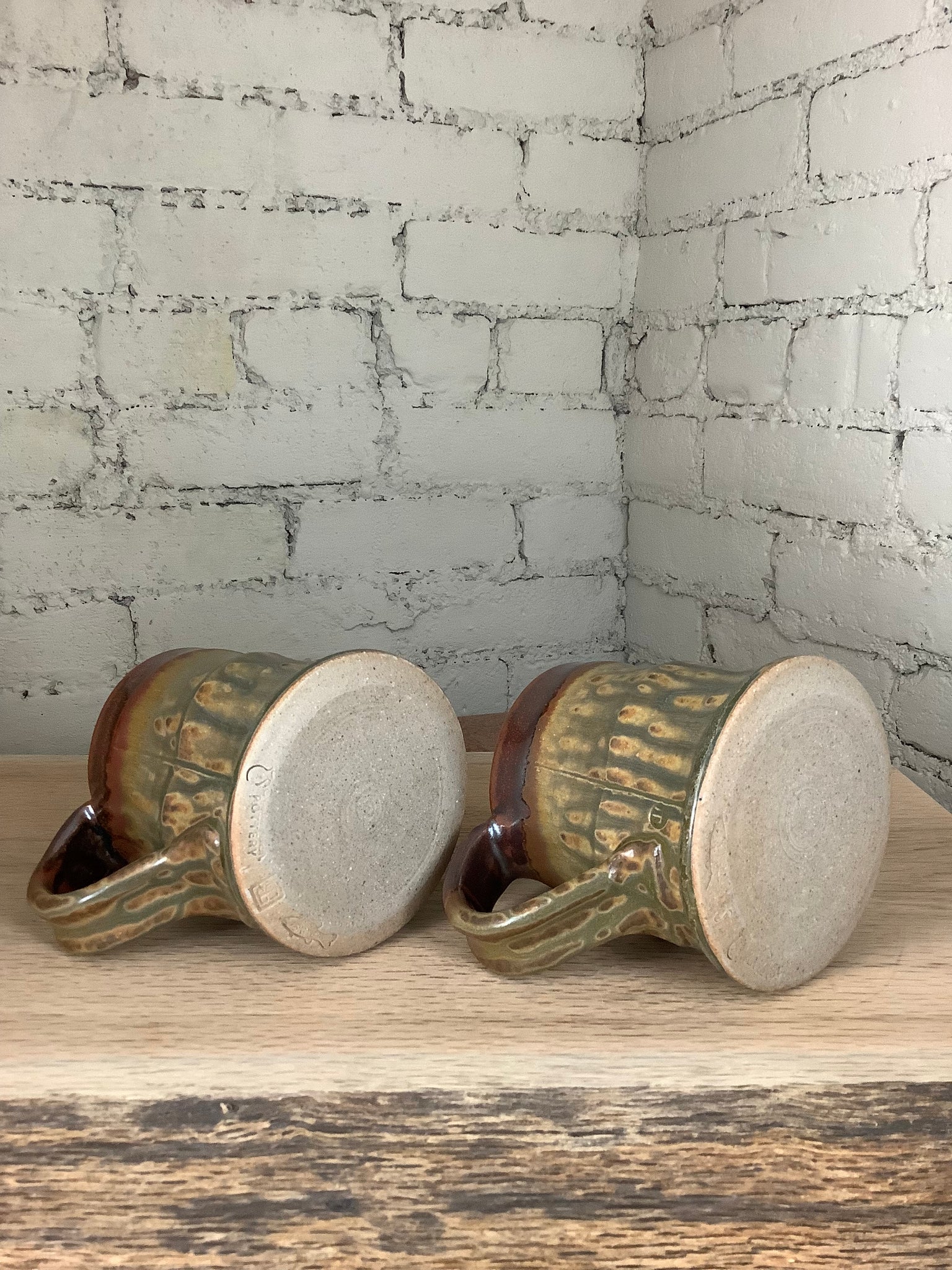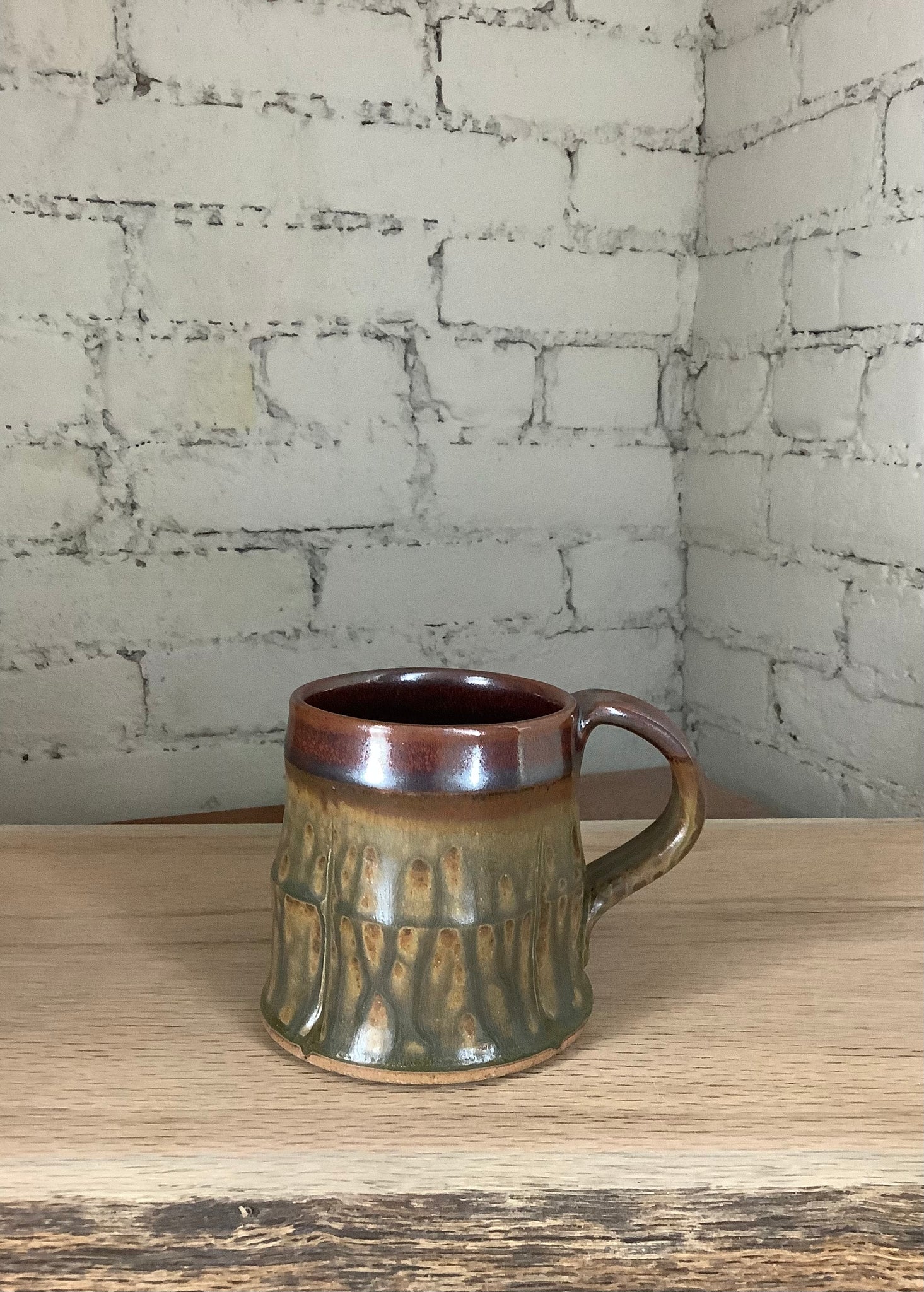 Each mug was fired onsite in our gas kiln at Goshen’s historic Old Bag Factory. We begin the firing in the evening and leave it to warm up overnight. In the morning, we raise the temperature to 2100 F, then perform a series of intentional temperature holds and decreases throughout the day to affect the color quality of the pieces within.