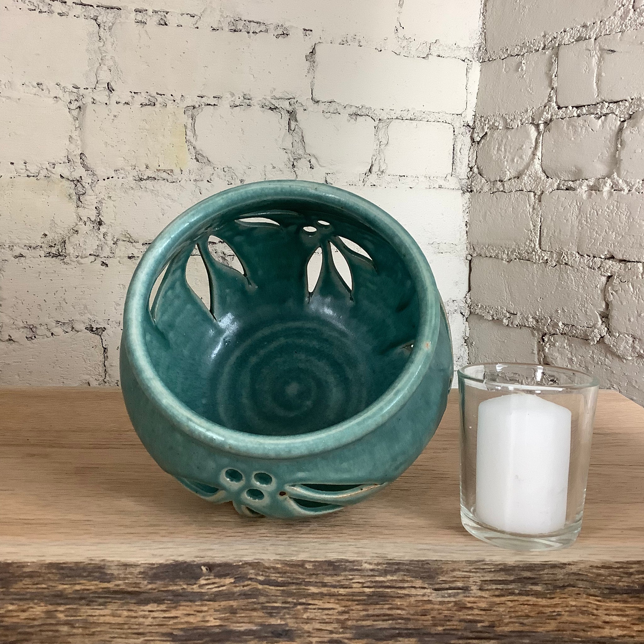 This piece was thrown on the potter's wheel, carved and glazed by hand, and fired onsite in our gas kiln at Goshen’s historic Old Bag Factory. It stands 4" tall and 4" wide across the rim. A safe way to bring cozy candlelight into any space.
