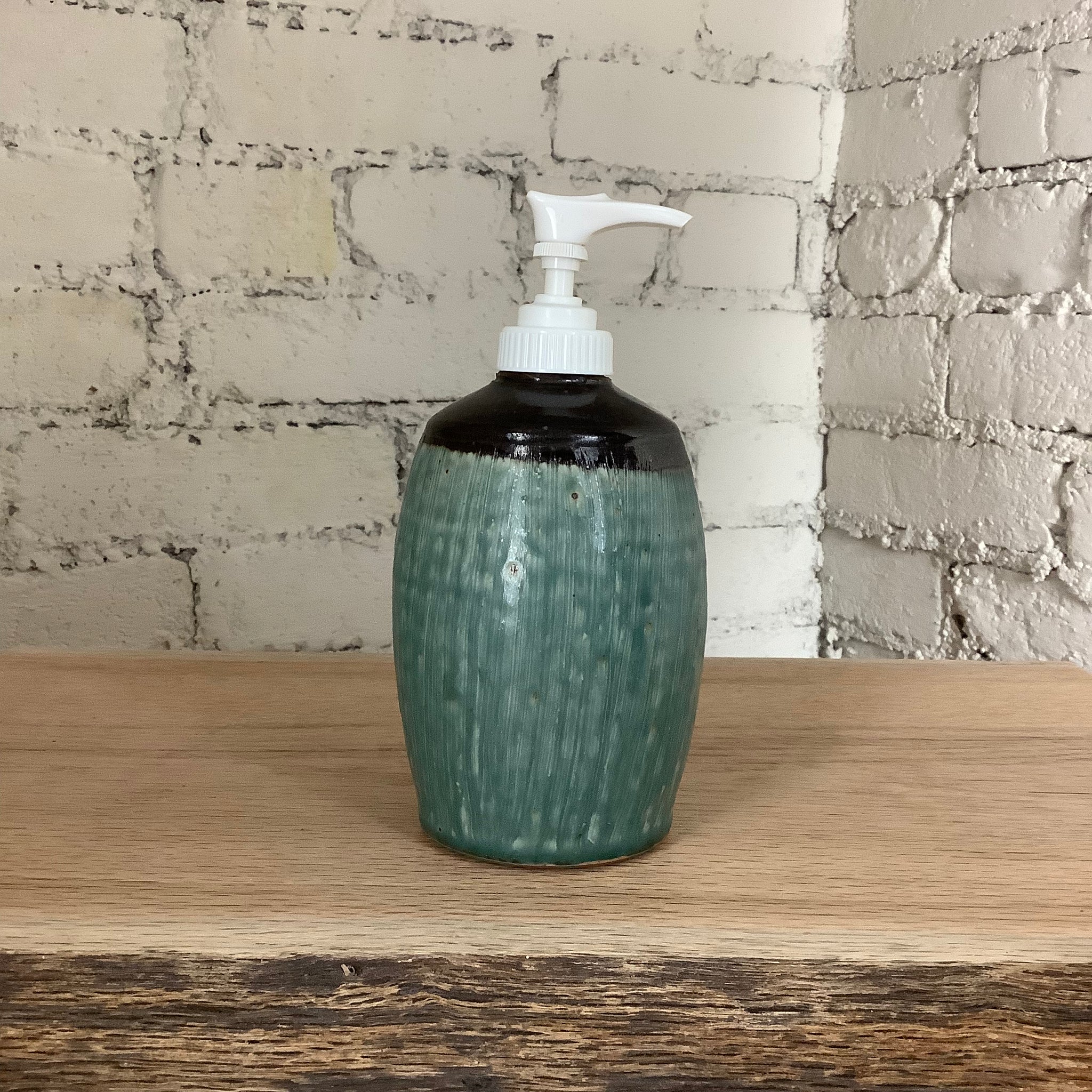 This piece was thrown on the potter's wheel, glazed by hand, and fired onsite in our gas kiln at Goshen’s historic Old Bag Factory. It stands 8" tall and 3" wide across the middle, holds about 12 ounces of your favorite lotion.