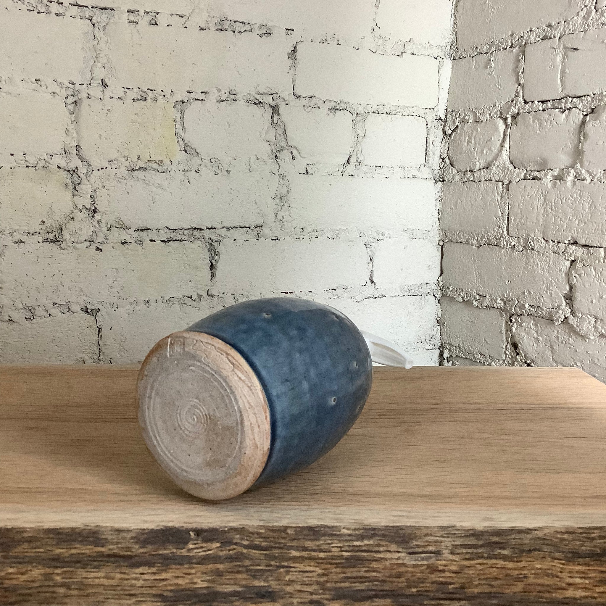 This piece was thrown on the potter's wheel, glazed by hand, and fired onsite in our gas kiln at Goshen’s historic Old Bag Factory. It stands 8" tall and 3" wide across the middle, holds about 12 ounces of your favorite lotion.