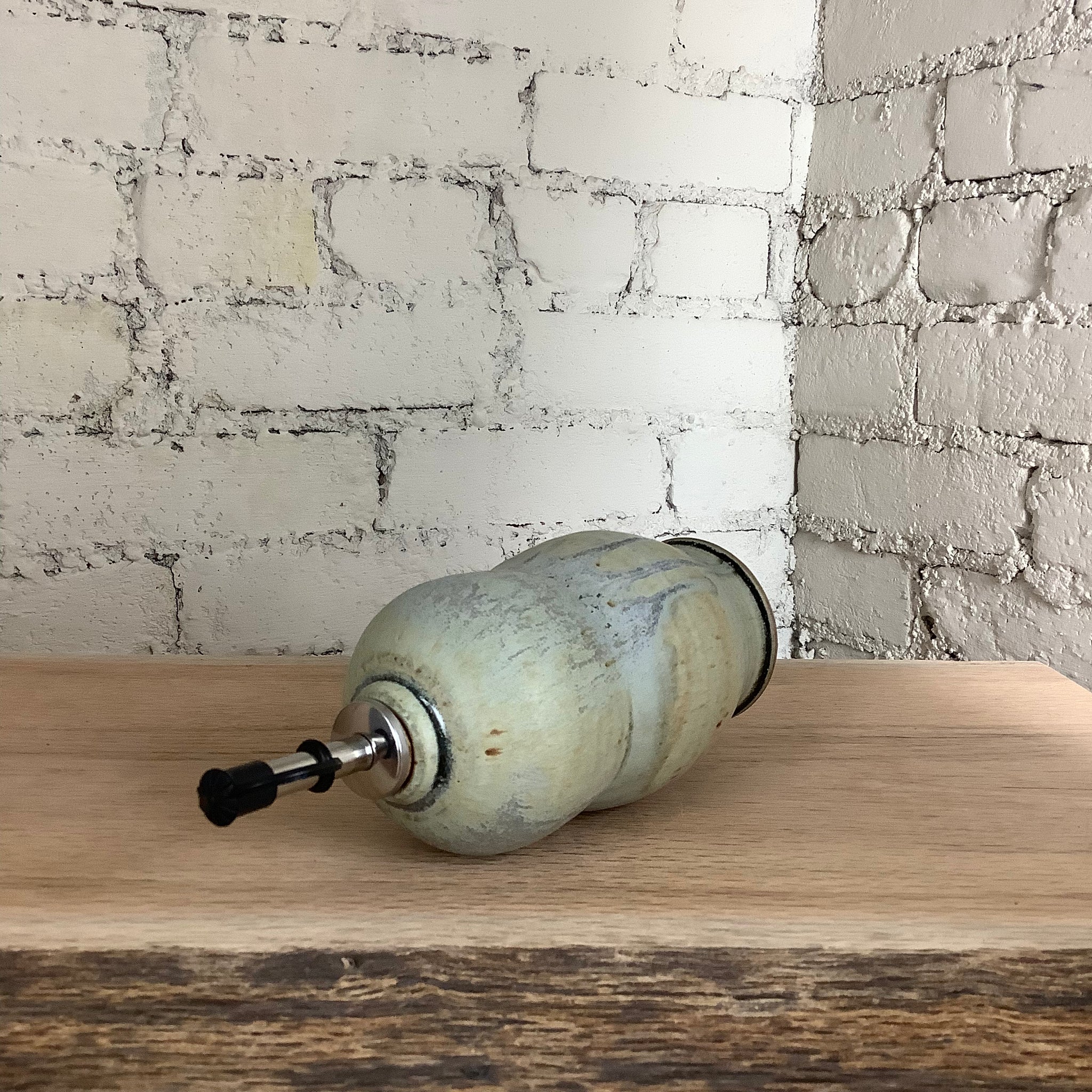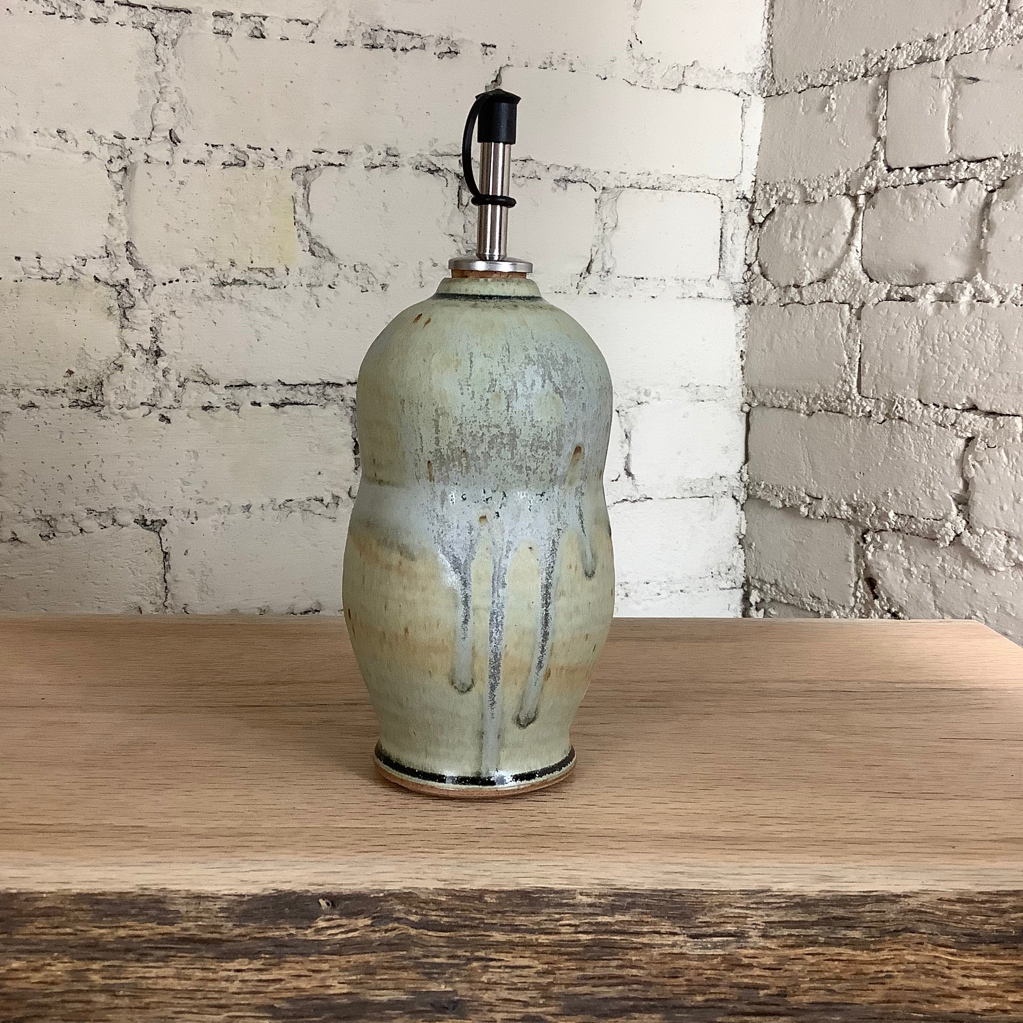This piece was thrown on the potter's wheel, glazed by hand, and fired onsite in our gas kiln at Goshen’s historic Old Bag Factory. It stands 8" tall and 3" wide across the middle of the pot, and it holds about 12 ounces of your favorite oil.