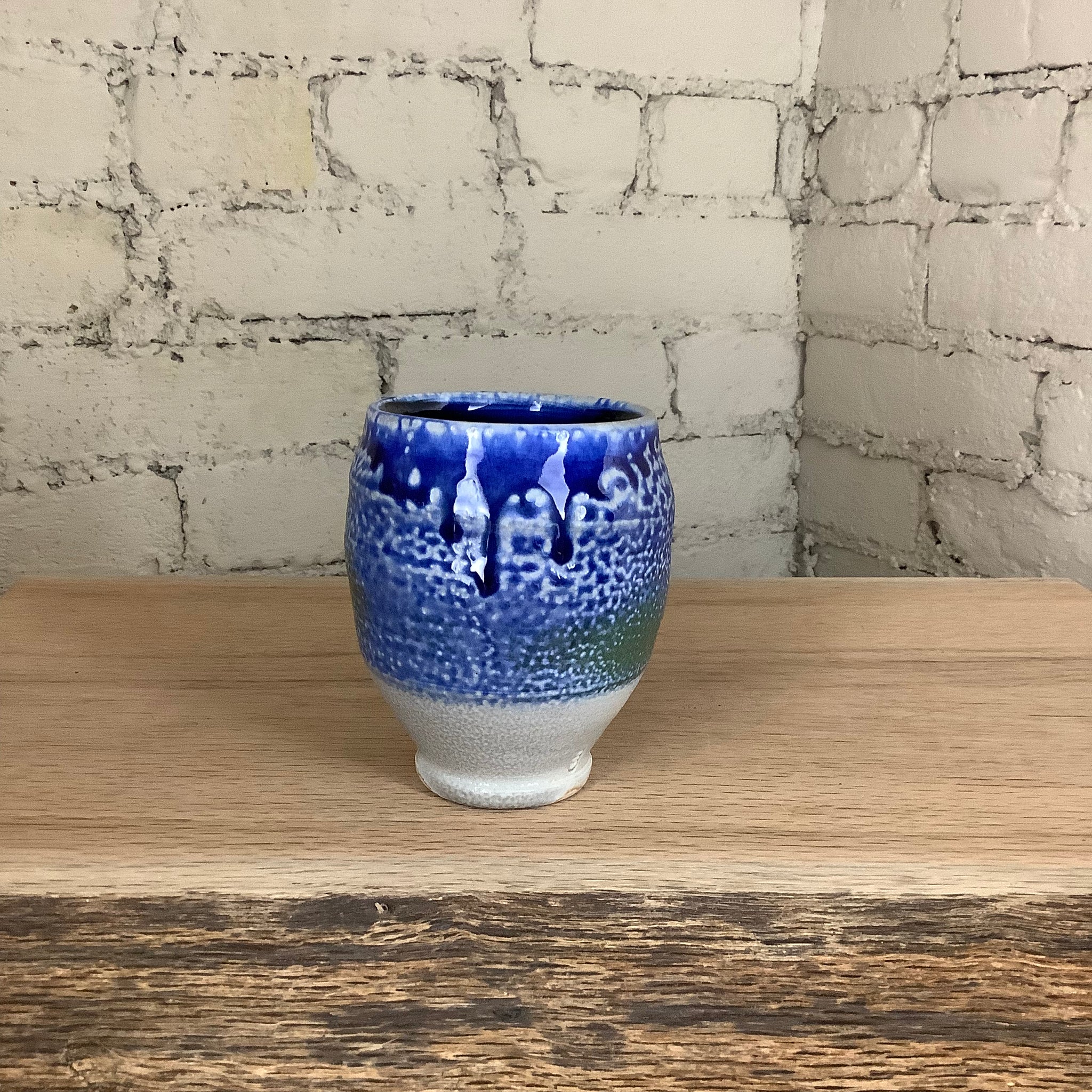 This delightful cup is fired with our unique glazes in our soda kiln. The cup has an exciting color transition between deep cobalt blue and a green tinted shade of black.
