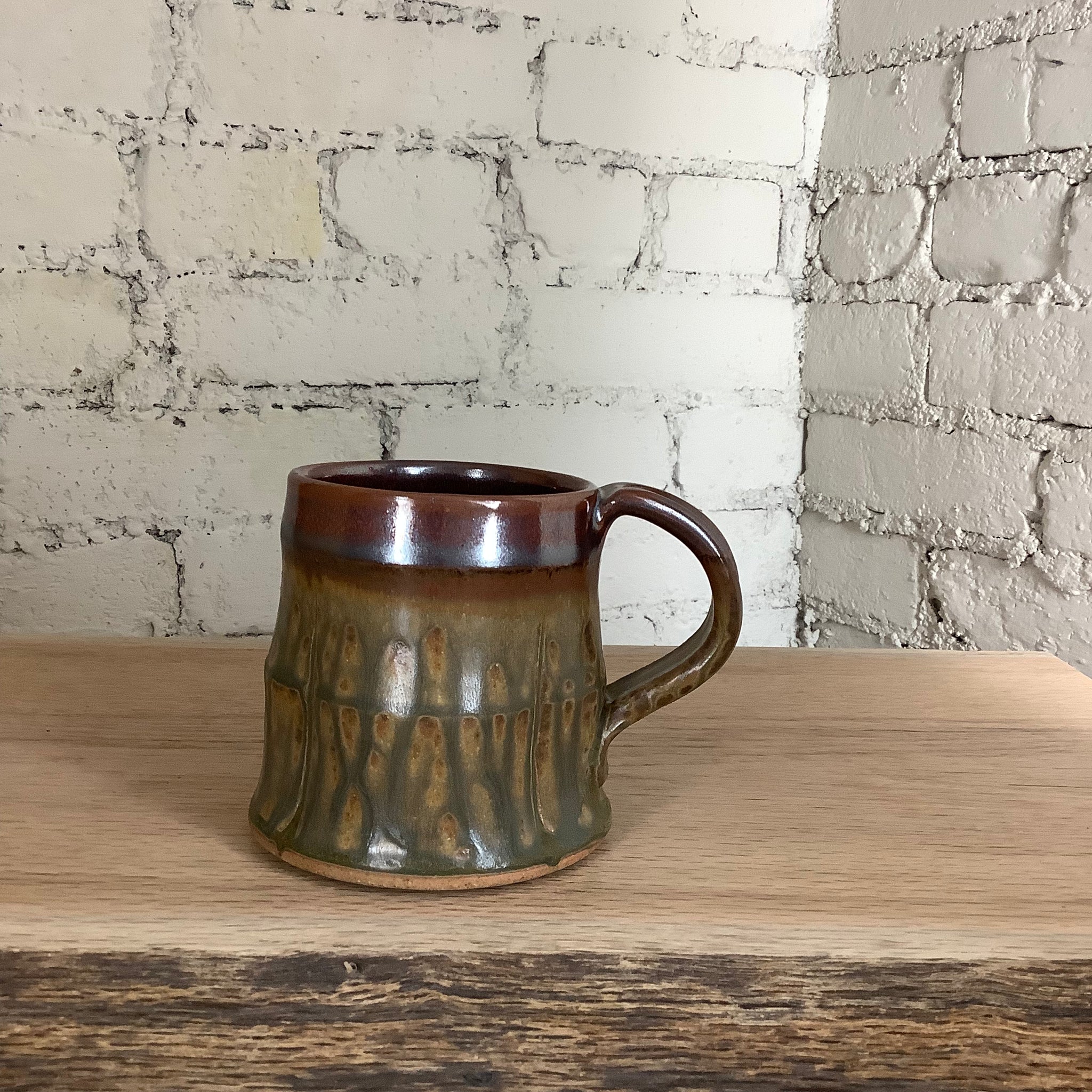 Each mug was fired onsite in our gas kiln at Goshen’s historic Old Bag Factory. We begin the firing in the evening and leave it to warm up overnight. In the morning, we raise the temperature to 2100 F, then perform a series of intentional temperature holds and decreases throughout the day to affect the color quality of the pieces within.
