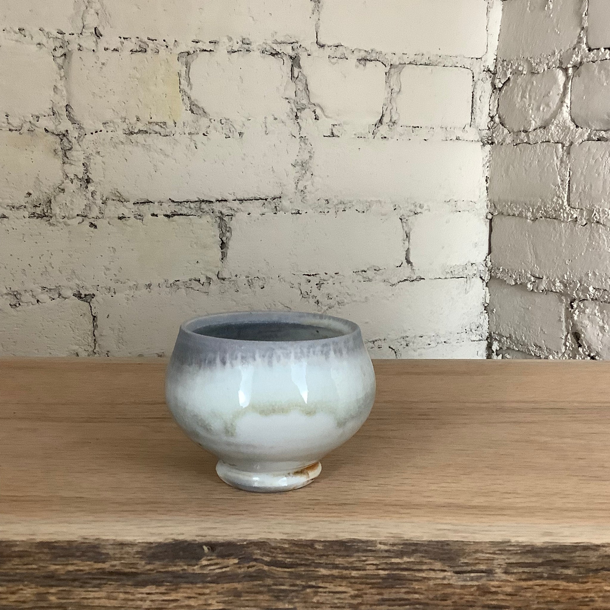 This cup was fired to a temperature of 2400 degrees Fahrenheit in a wood powered kiln. The effects are a result of the melted wood ash as well as the flame movements in the kiln.