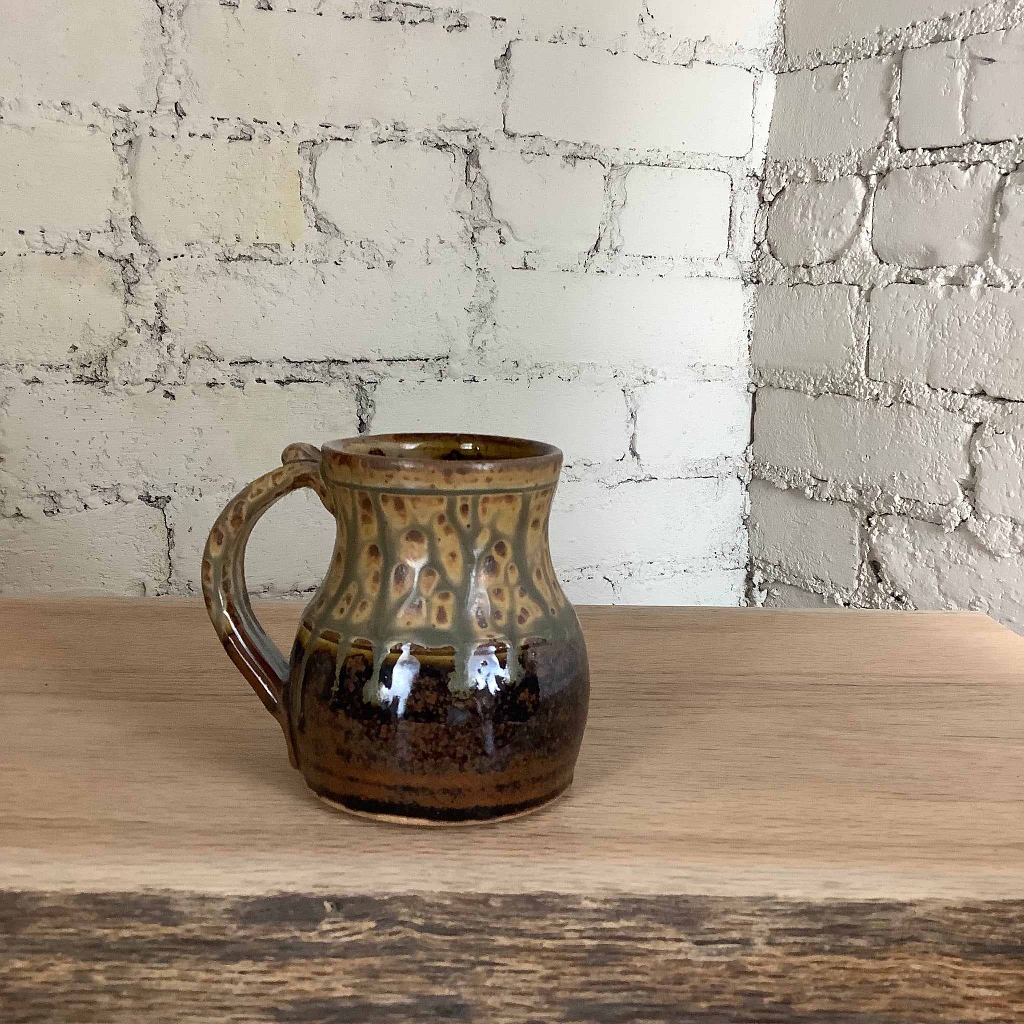 This mug was fired onsite in our gas kiln at Goshen’s historic Old Bag Factory. We begin the firing in the evening and leave it to warm up overnight. In the morning, we raise the temperature to 2100 F, then perform a series of intentional temperature holds and decreases throughout the day to affect the color quality of the pieces within.