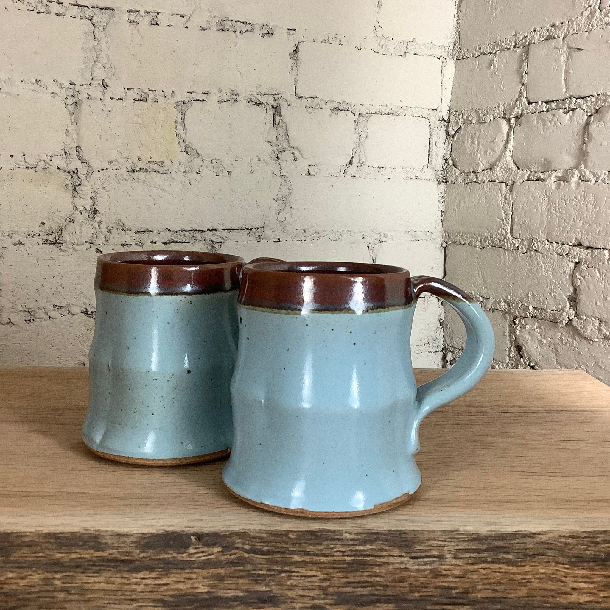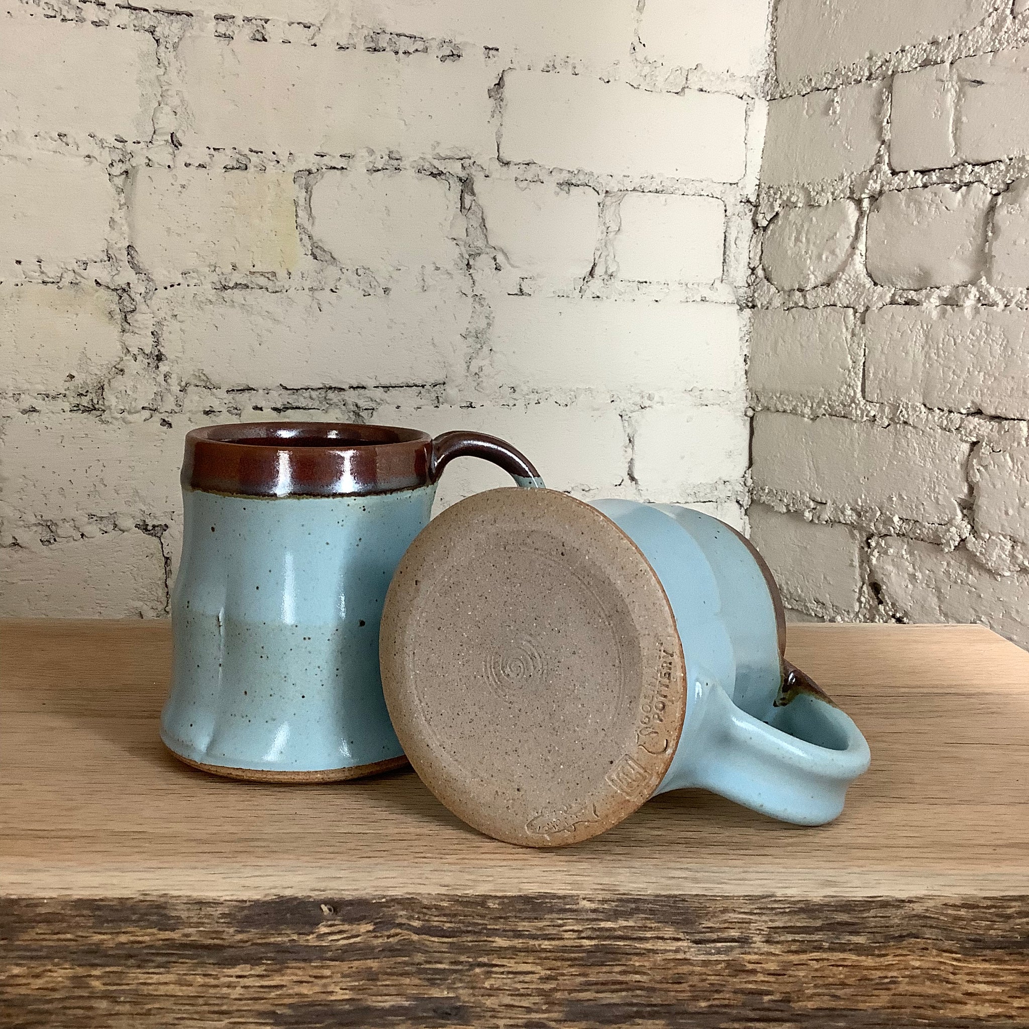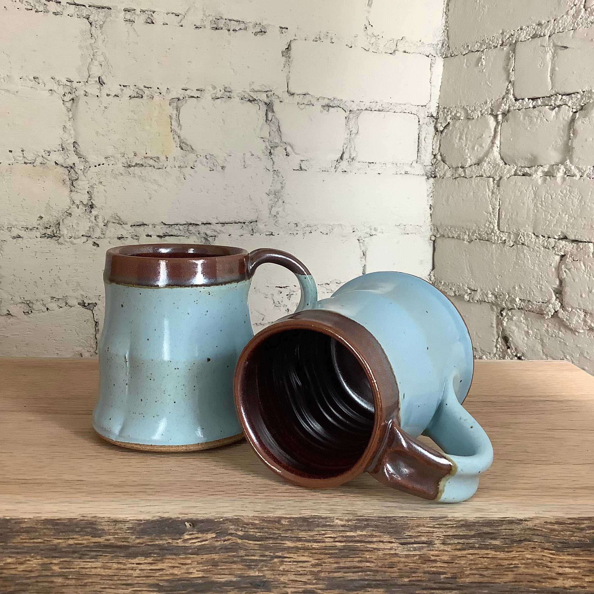 This mug was fired onsite in our gas kiln at Goshen’s historic Old Bag Factory. We begin the firing in the evening and leave it to warm up overnight. In the morning, we raise the temperature to 2100 F, then perform a series of intentional temperature holds and decreases throughout the day to affect the color quality of the pieces within.