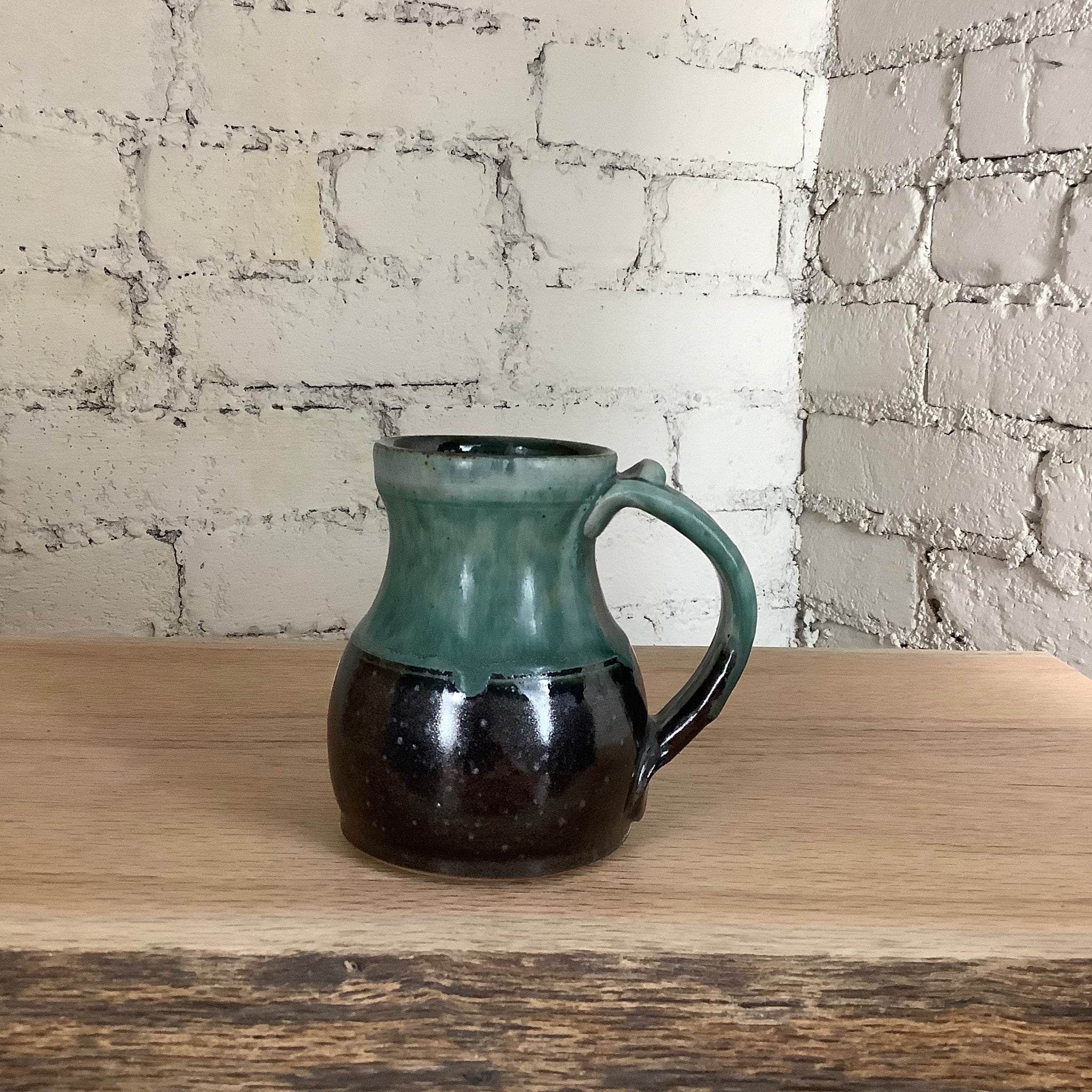 This mug was fired onsite in our gas kiln at Goshen’s historic Old Bag Factory. We begin the firing in the evening and leave it to warm up overnight. In the morning, we raise the temperature to 2100 F, then perform a series of intentional temperature holds and decreases throughout the day to affect the color quality of the pieces within.