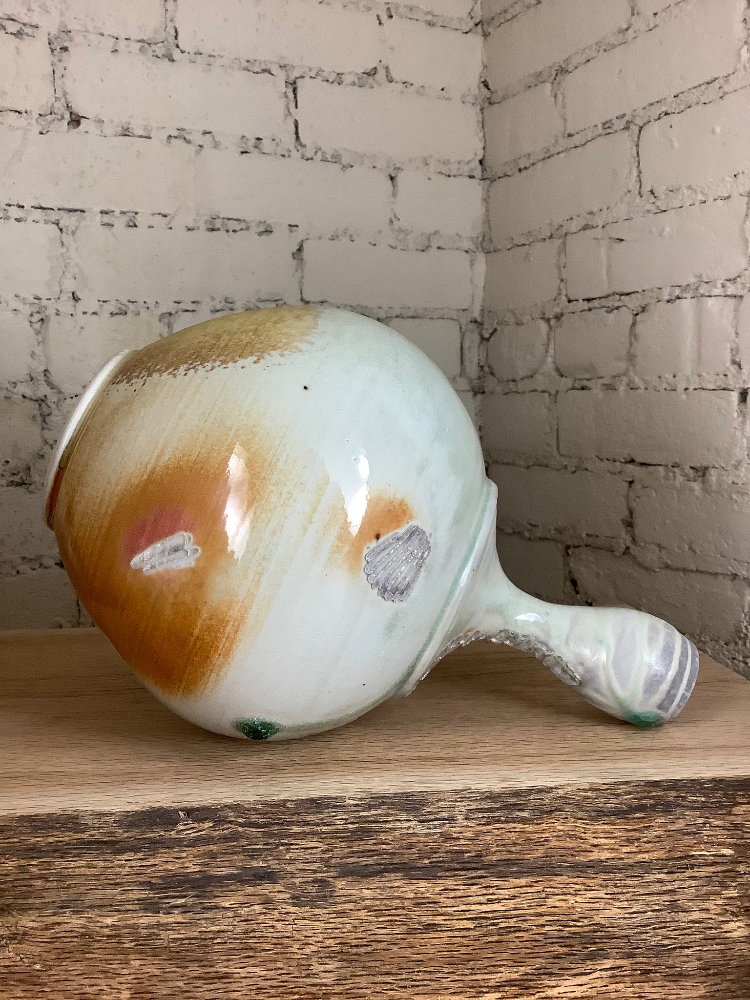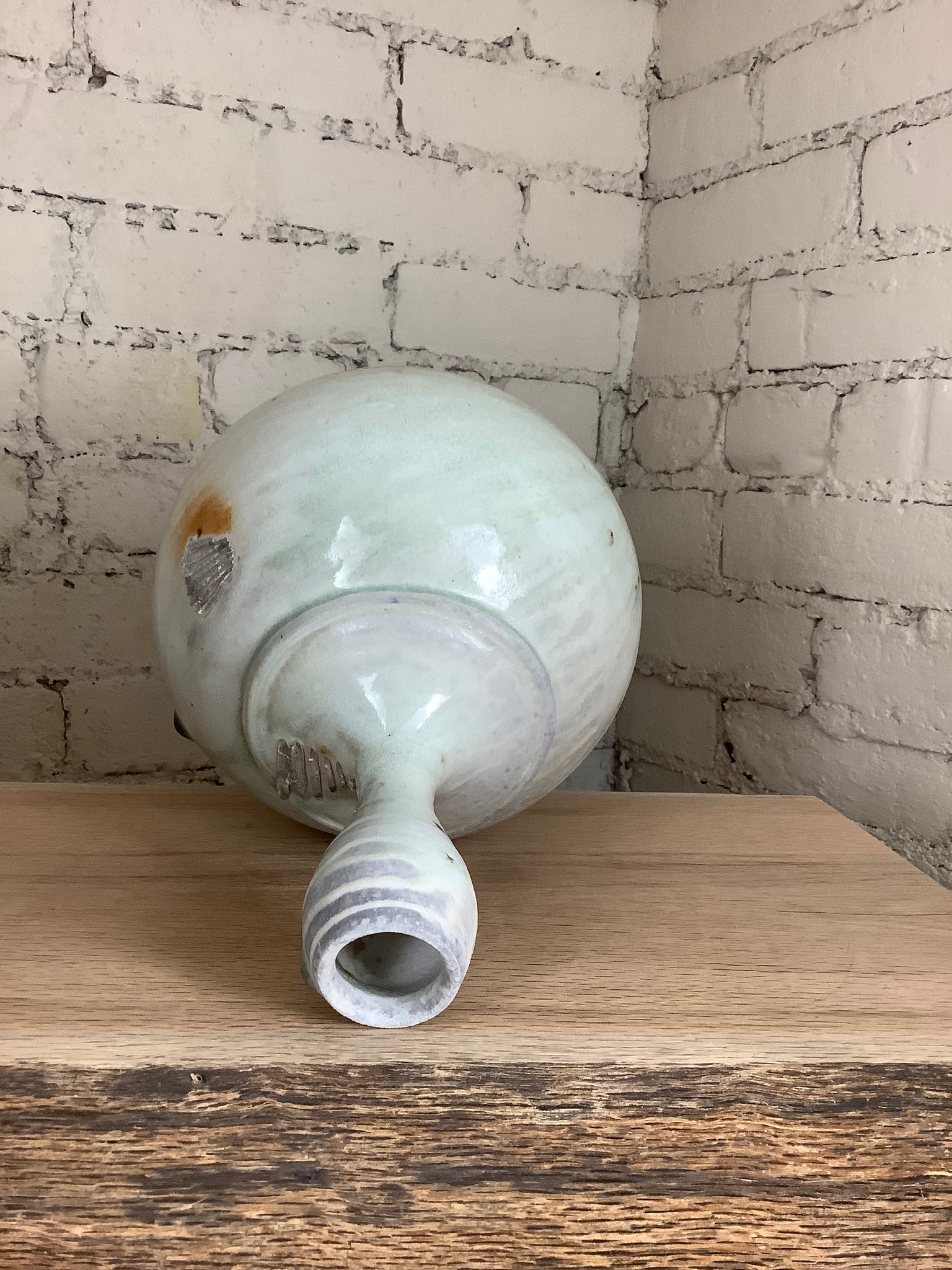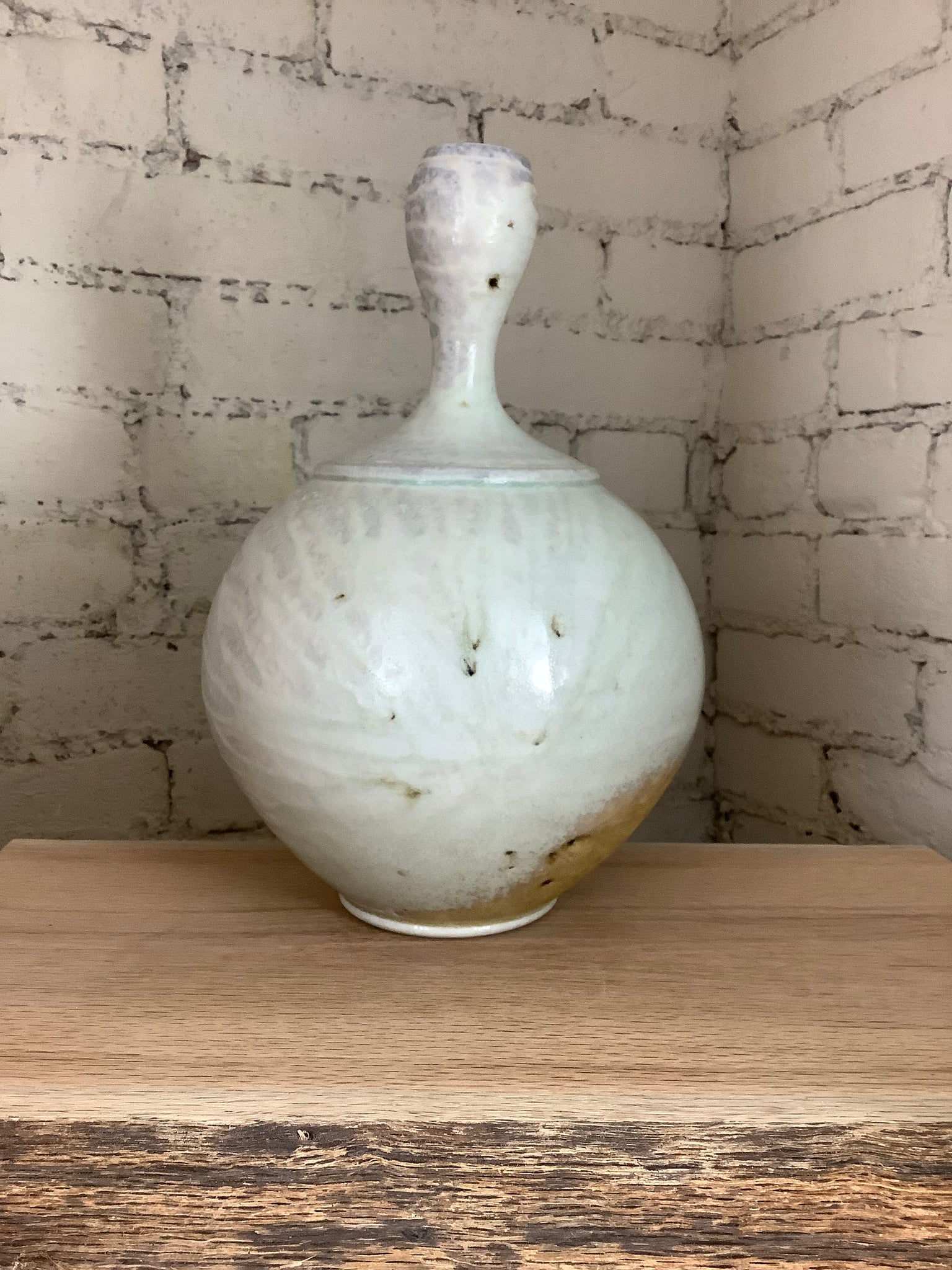 This piece was hand thrown on the potter's wheel. Then fired to 2400 degrees Fahrenheit using only wood. The kiln was stoked around the clock every 12 to 15 minutes for approximately 60 hours. The effects on the surface of the pot are created by the kiln's flames, which travel around the piece like water, and by wood ash that collects on the surface of the pot, melts, then hardens to form a glaze. The vase is 11 1/2" tall and is 8" wide at its widest.